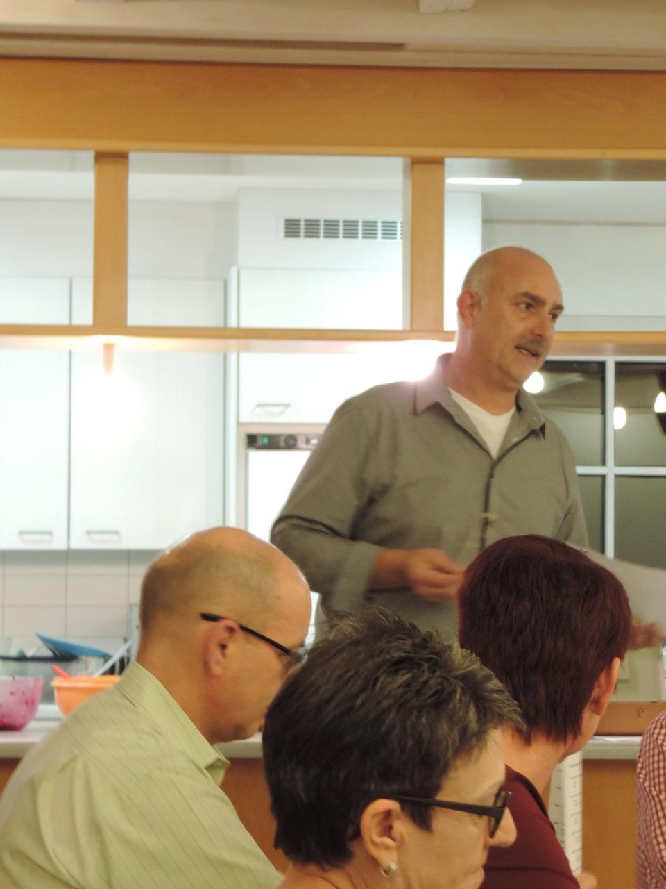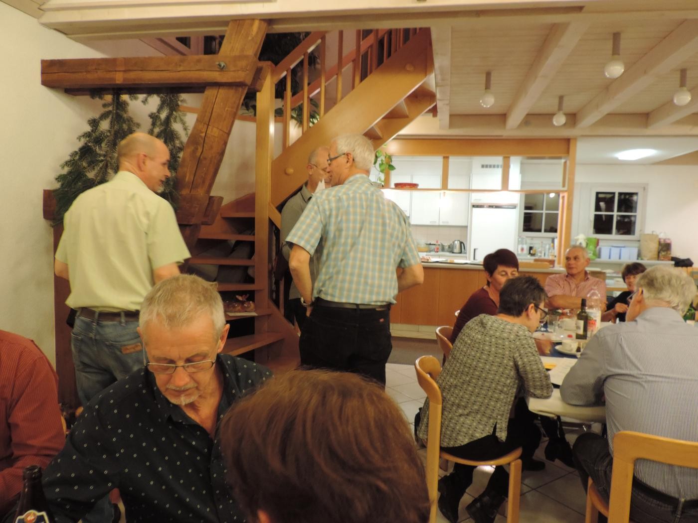 Bei diesem Anlass steht das gesellige Zusammensein im Vordergrund und so ist schon bald das Gmeinschürli von einem Stimmengewirr von all den plaudernden Männerrieglern erfüllt. Doch dann wurde zum Essen gerufen. Tischweise versorgten sich alle mit den leckeren Salaten und später mit dem Essen, so dass man sich beim Anstehen mit vielen unterhalten konnte.