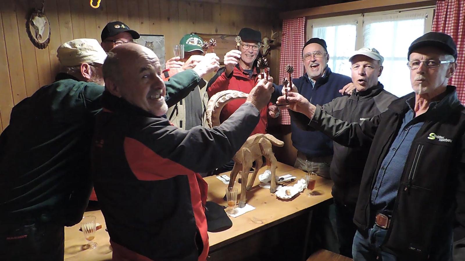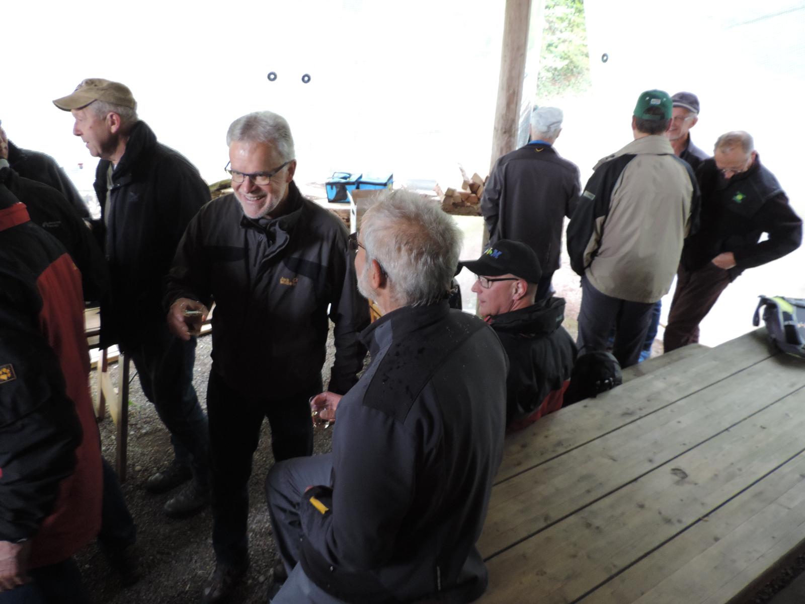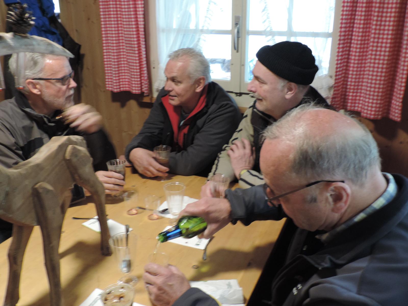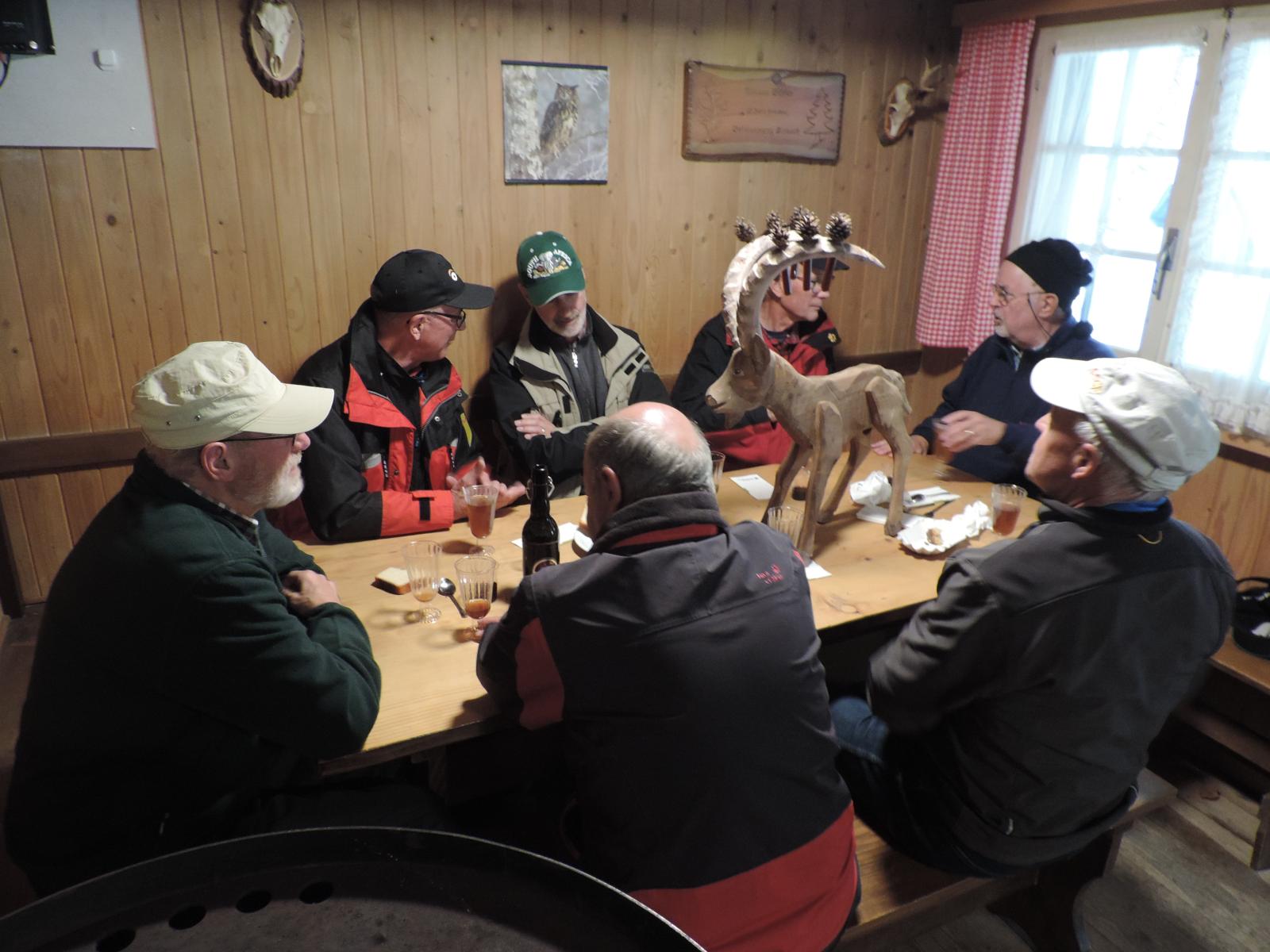 Auch hier war nur vereinzelt Vogelgezwitscher zu hören; einerseits waren die Vögel infolge Schnee auf den Aesten nicht in Stimmung, anderseits wurden diese von den gesprächs-freudigen Wanderern übertönt. Schlag 10.00 Uhr war der obligate Kaffehalt mit Gipfeli im Parkcafé im Kurdorf Dussnang. Gestärkt wurde der Anstieg über Haushalden und Bäritsrit zur Mittagsrast in der Bürgerhütte unter die Füsse genommen. Das Feuer loderte bereits draussen und drinnen. Zudem schützte noch ein Blache vor Wind und Kälte. Somit musste nach dem Apéro niemand frieren um mit feinen Grilladen und Salat den Hunger zu stillen. Bei sehr angeregten Diskussionen, Witz und etwas Gesang verging die Zeit wie im Flug. Kaffee und Kuchen rundeten den geselligen Nachmittag ab. Kameradschaftlich gestärkt führte der Rückmarsch über Hurnen in die warmen Stuben.