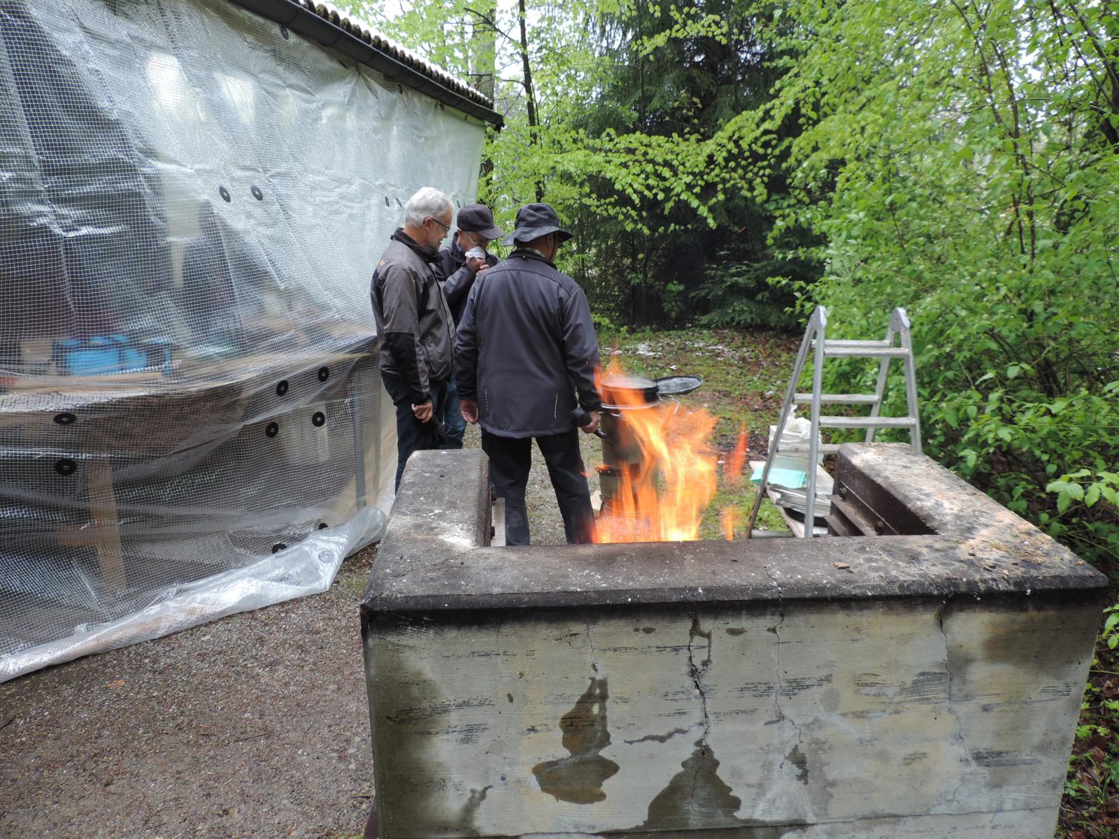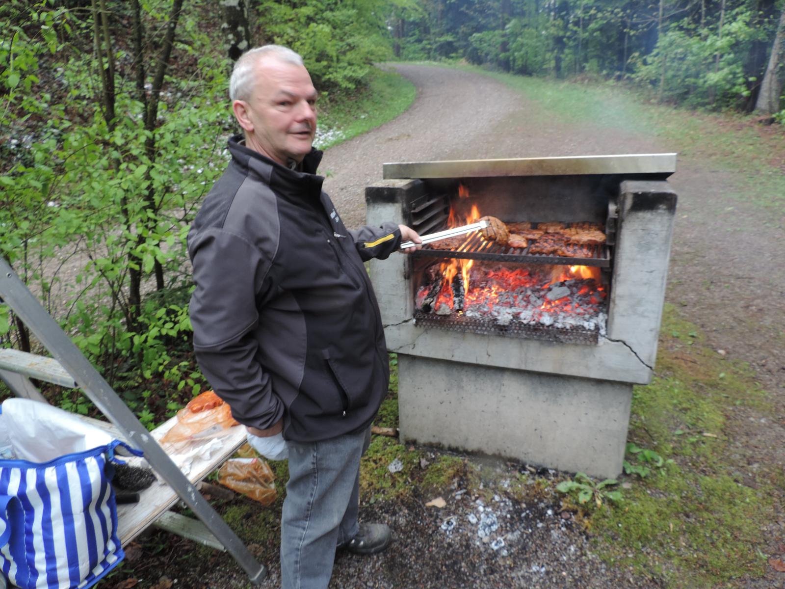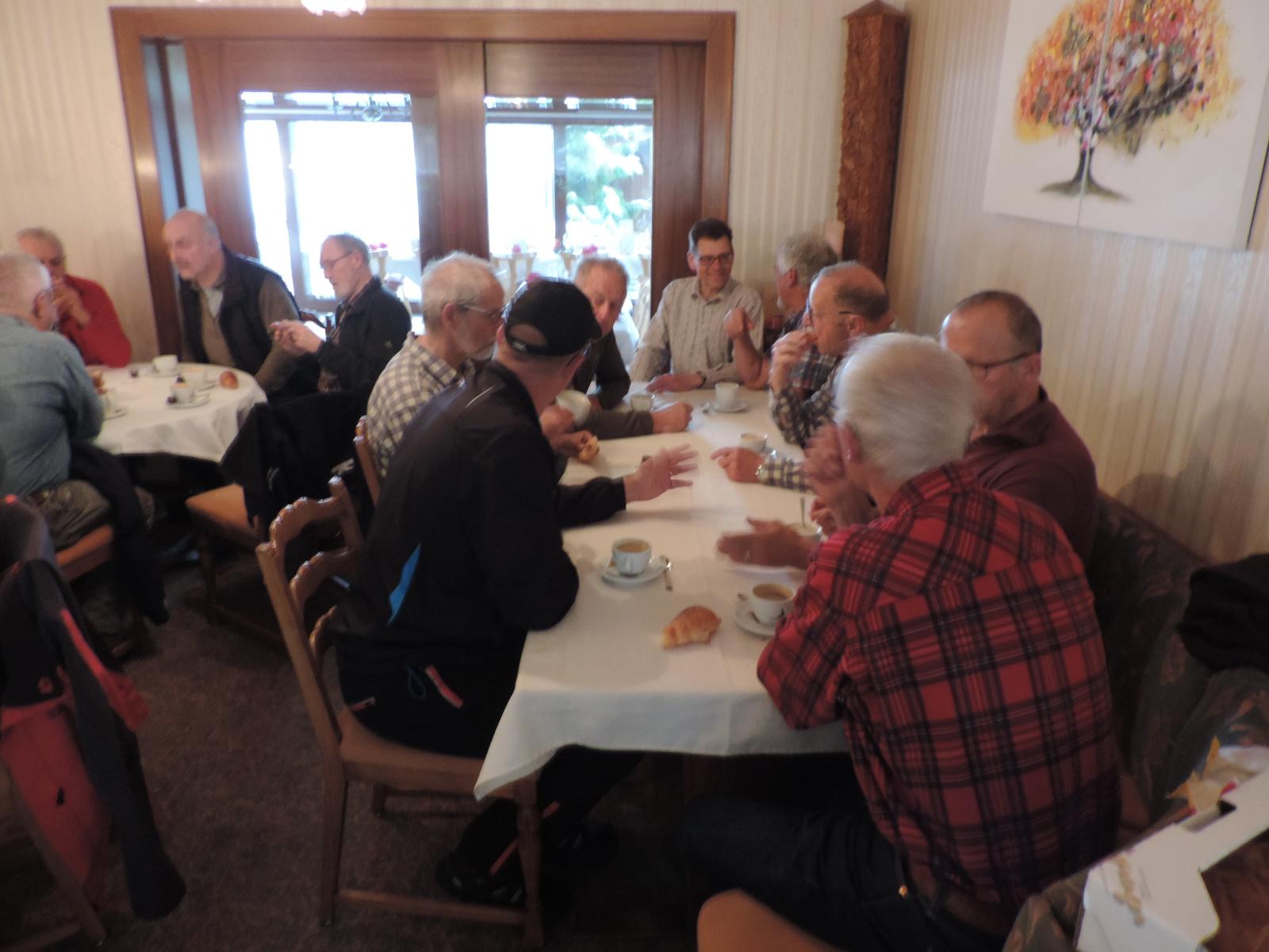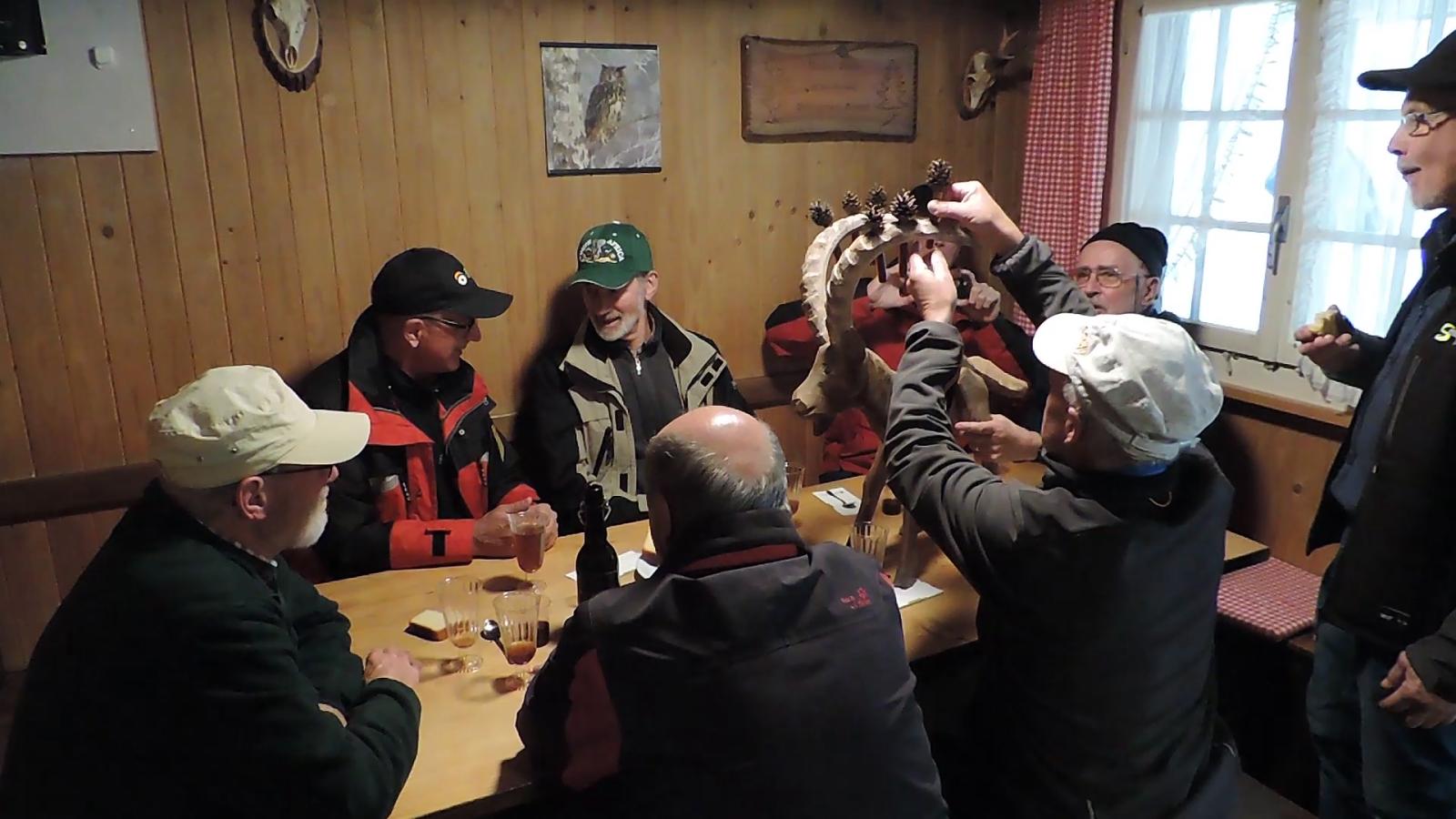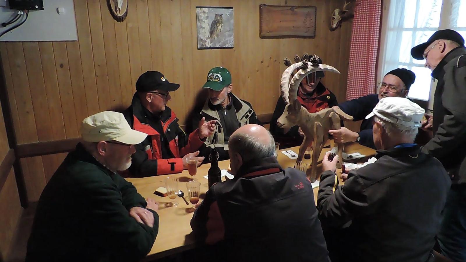 Auch hier war nur vereinzelt Vogelgezwitscher zu hören; einerseits waren die Vögel infolge Schnee auf den Aesten nicht in Stimmung, anderseits wurden diese von den gesprächs-freudigen Wanderern übertönt. Schlag 10.00 Uhr war der obligate Kaffehalt mit Gipfeli im Parkcafé im Kurdorf Dussnang. Gestärkt wurde der Anstieg über Haushalden und Bäritsrit zur Mittagsrast in der Bürgerhütte unter die Füsse genommen. Das Feuer loderte bereits draussen und drinnen. Zudem schützte noch ein Blache vor Wind und Kälte. Somit musste nach dem Apéro niemand frieren um mit feinen Grilladen und Salat den Hunger zu stillen. Bei sehr angeregten Diskussionen, Witz und etwas Gesang verging die Zeit wie im Flug. Kaffee und Kuchen rundeten den geselligen Nachmittag ab. Kameradschaftlich gestärkt führte der Rückmarsch über Hurnen in die warmen Stuben.