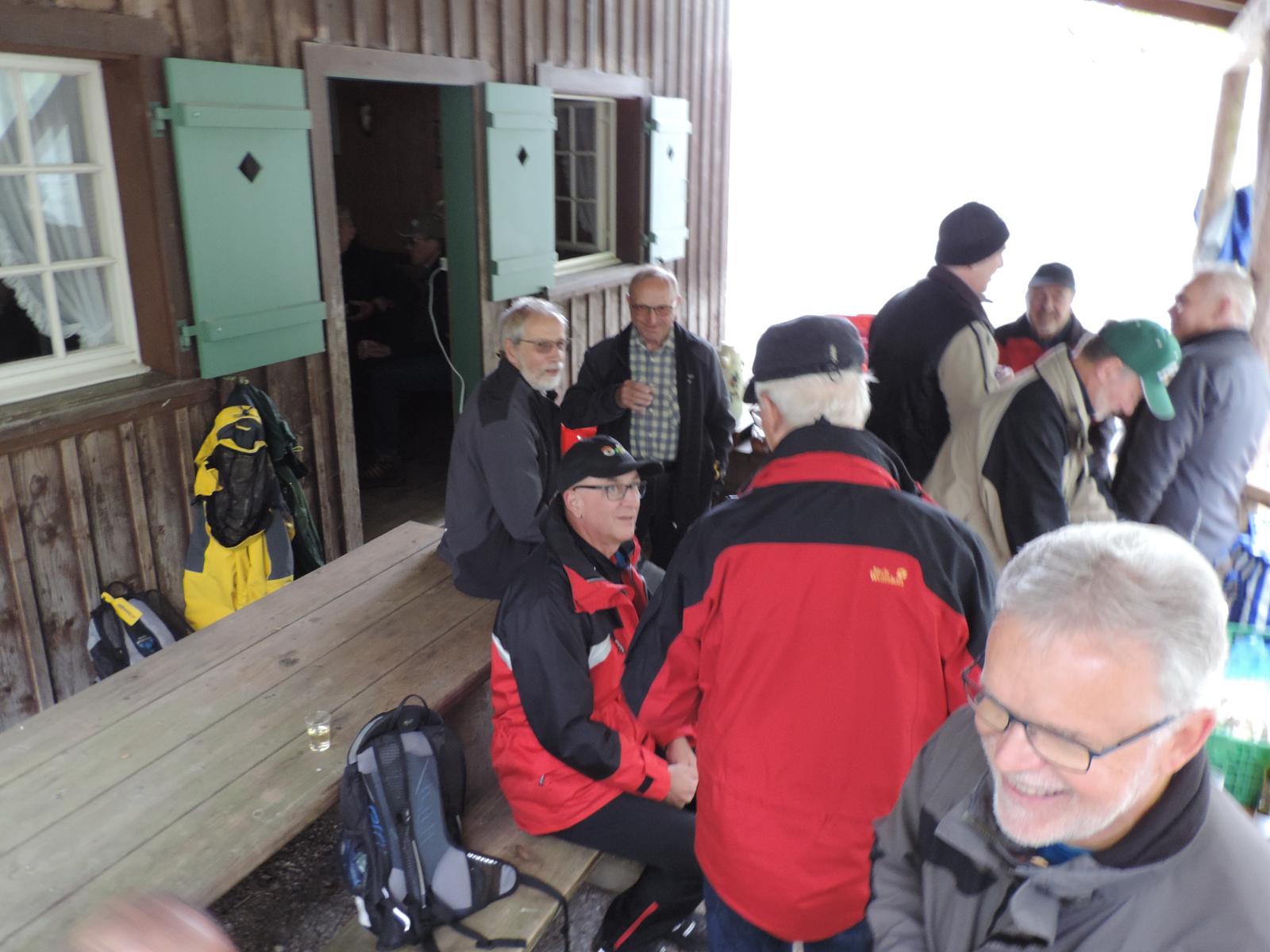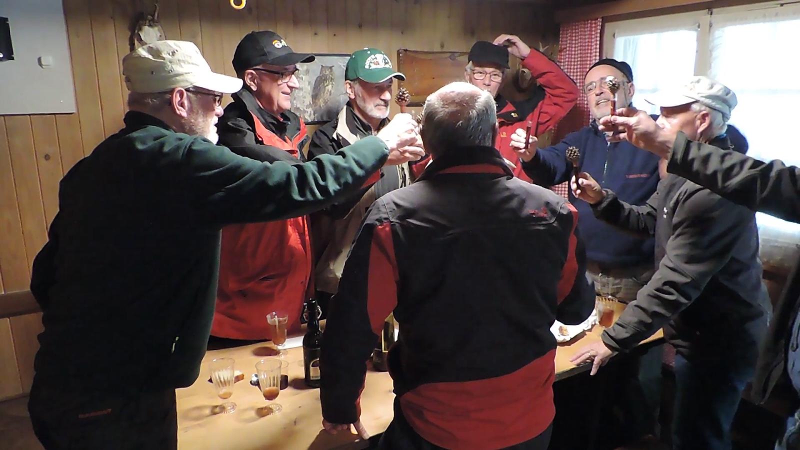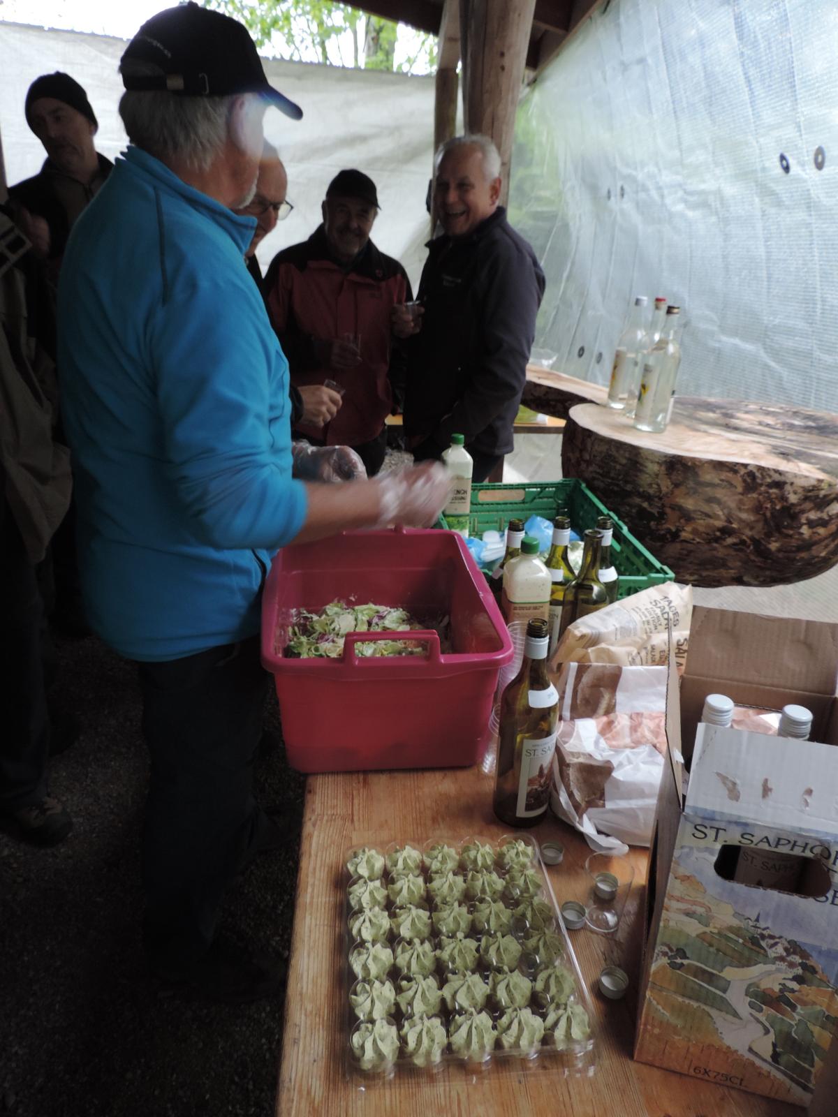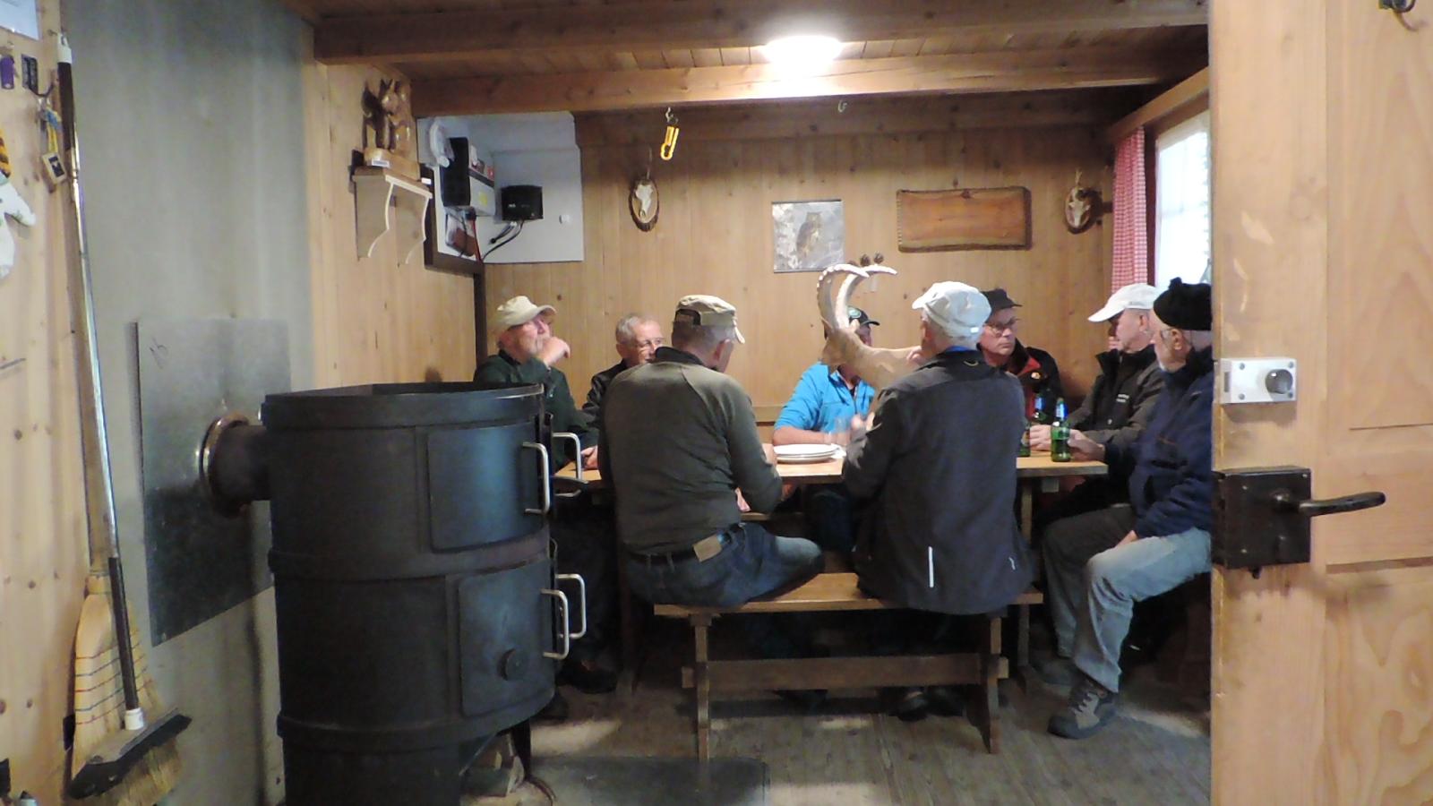 Auch hier war nur vereinzelt Vogelgezwitscher zu hören; einerseits waren die Vögel infolge Schnee auf den Aesten nicht in Stimmung, anderseits wurden diese von den gesprächs-freudigen Wanderern übertönt. Schlag 10.00 Uhr war der obligate Kaffehalt mit Gipfeli im Parkcafé im Kurdorf Dussnang. Gestärkt wurde der Anstieg über Haushalden und Bäritsrit zur Mittagsrast in der Bürgerhütte unter die Füsse genommen. Das Feuer loderte bereits draussen und drinnen. Zudem schützte noch ein Blache vor Wind und Kälte. Somit musste nach dem Apéro niemand frieren um mit feinen Grilladen und Salat den Hunger zu stillen. Bei sehr angeregten Diskussionen, Witz und etwas Gesang verging die Zeit wie im Flug. Kaffee und Kuchen rundeten den geselligen Nachmittag ab. Kameradschaftlich gestärkt führte der Rückmarsch über Hurnen in die warmen Stuben.